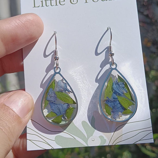 Hand picked, pressed, and set in UV resin, these earrings are all unique. All flowers are either from my own garden or from the Aussie native nursery I work at. They are lightweight in design and all have stainless steel hooks for sensitive skin.