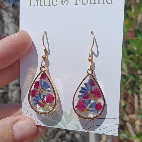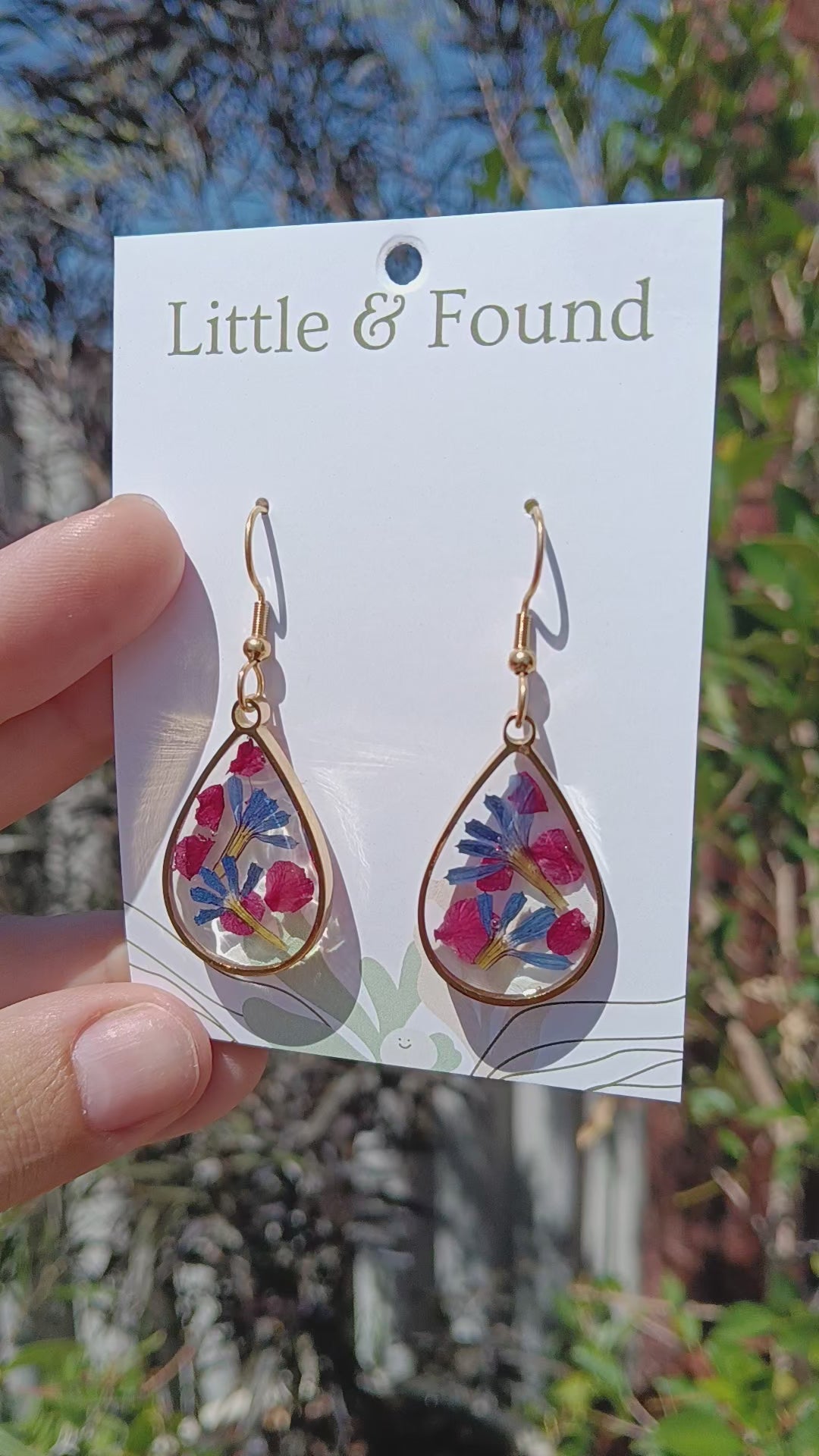 Hand picked, pressed, and set in UV resin, these earrings are all unique. All flowers are either from my own garden or from the Aussie native nursery I work at. They are lightweight in design and all have stainless steel hooks for sensitive skin.